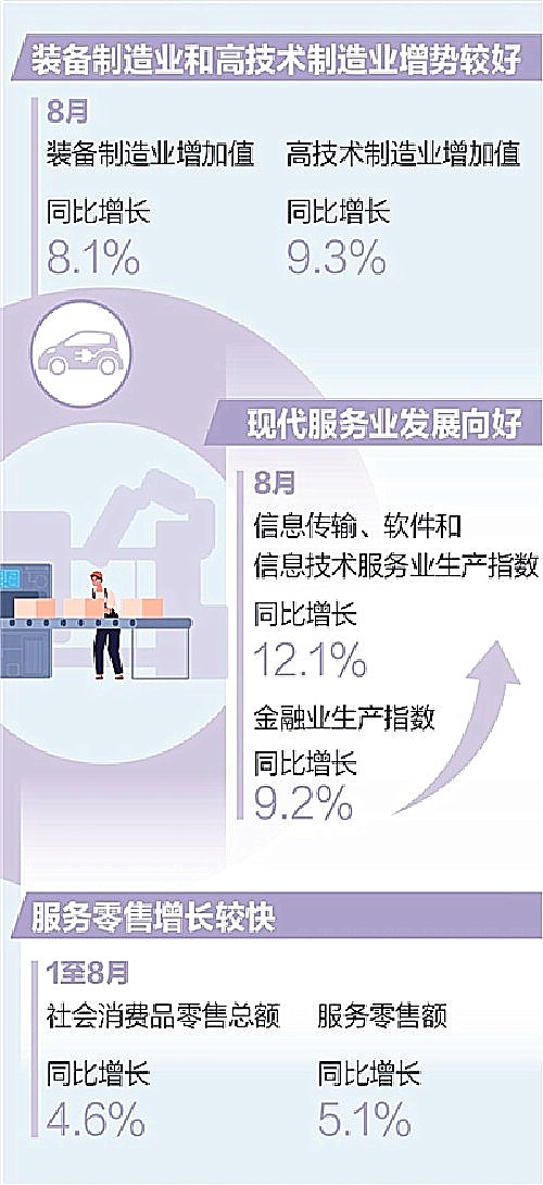 向高攀登。8月规模以上装备制造业和高技术制造业增加值同比分别增长8.1%、9.3%,均明显快于规模以上工业,产业升级态势良好。