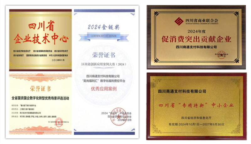 公司是中国预付卡工作委员会副主任单位、中国支付清算协会会员单位、国家发改委电子支付试点项目单位、国家区块链创新应用试点企业、国家高新技术企业、四川省战略性新兴产业项目单位、四川省“专精特新”企业、四川省企业技术中心。公司获得国家网信办区块链平台信息服务备案许可,入选国家工信部新型信息消费示范项目。