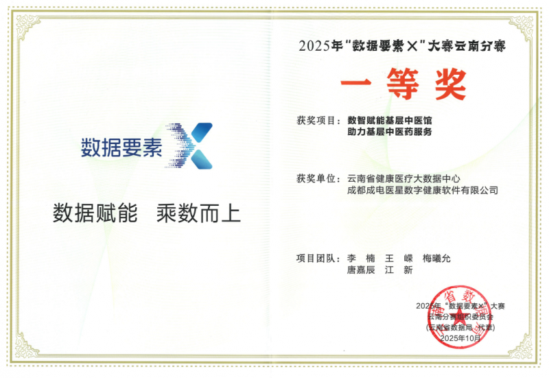 10月13日,由国家数据局、云南省人民政府指导,云南省数据局会同省委网信办、省工业和信息化厅等19个部门共同举办的2025年“数据要素×”大赛云南分赛颁奖仪式在昆明举行。本次大赛以“数据赋能 乘数而上”为主题,设置了13个赛道87个赛题,旨在挖掘数据要素在各行业领域创新应用的标杆案例,充分发挥数据要素在经济社会发展中的乘数效应。协会会员单位成都成电医星数字健康软件有限公司申报的“数智赋能基层中医馆 助力基层中医药服务”项目凭借突出的数字化创新能力,从数百个项目中脱颖而出,获医疗健康赛道一等奖。