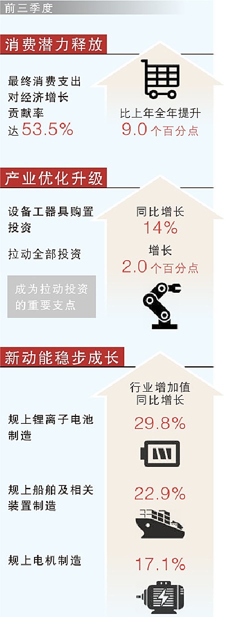 看发展质量,经济转型升级态势持续。三季度,规模以上高技术制造业增加值同比增速明显快于全部工业;信息传输、软件和信息技术服务业增加值增长11.7%,比上年同期加快1.7个百分点。