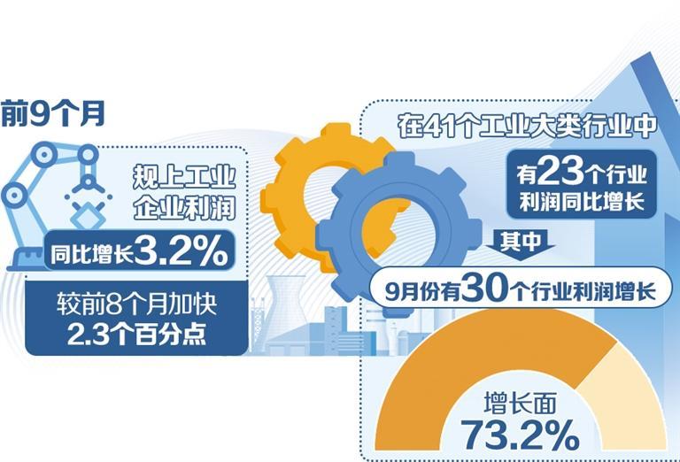 装备制造业支撑有力。前9个月,规上装备制造业利润同比增长9.4%,高于全部规上工业平均水平6.2个百分点,拉动全部规上工业企业利润增长3.4个百分点。