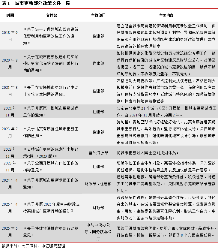 1、我国城市更新由地方实践先行,深圳、广州、上海等城市更新创新实践的排头兵较早地形成了各具自身特色的城市更新模式,并出台了各自的城市更新相关政策。自2021年城市更新上升为国家战略后,国家层面出台了一系列相关政策文件。2025年5月,中共中央办公厅、国务院办公厅发布《关于持续推进城市更新行动的意见》,成为新时期推动城市更新纲领性的文件。《意见》围绕促进城市结构优化、功能完善、文脉赓续、品质提升,打造宜居、韧性、智慧城市,部署了8个方面主要任务。