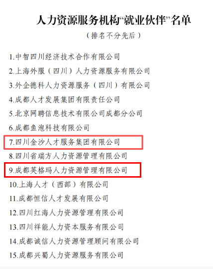 近日,协会副会长单位四川金沙人才服务集团有限公司、常务理事单位成都英格玛人力资源管理有限公司成功入选成都市首批经营性人力资源服务机构“就业伙伴”名单,并受邀参加12月30日由成都市人力资源和社会保障局、成都市商务局指导,金牛区人民政府主办举办的“立园满园·共赢发展——人力资源服务业与商贸商务服务业融合发展大会”。