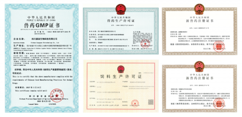 公司于2022年1月22日通过四川省农业农村厅新版GMP 验收,取得了“GMP证书”、“兽药生产许可证”、“饲料添加剂生产许可证”、“消毒产品生产许可证”良好质量和信誉证书等。