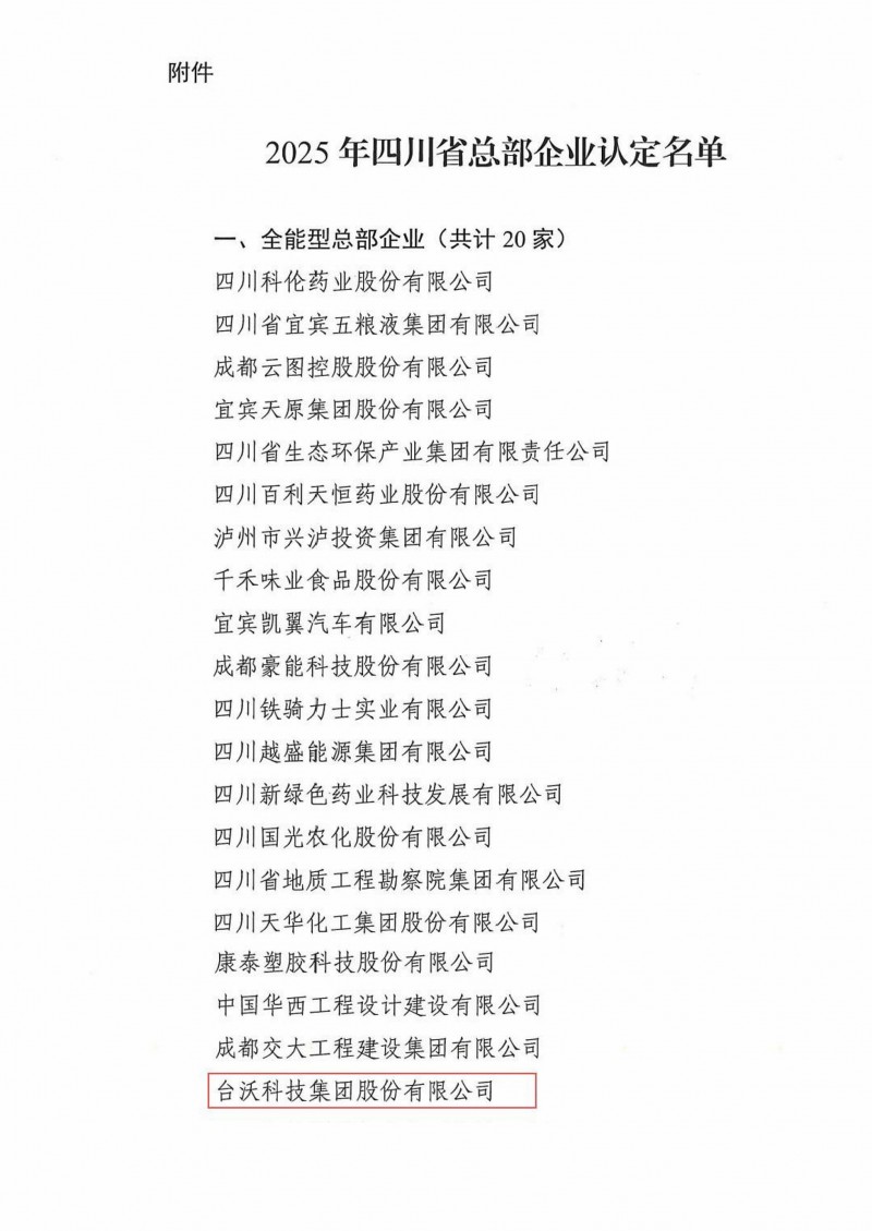 近日,四川省发改委等五部门联合印发《关于认定2025年四川省总部企业的通知》,三台本土民营科技龙头企业——协会会员单位台沃科技集团成功入围并获全能型总部企业,此乃台沃发展的重要里程碑,也是三台县域经济发展的重大喜讯。本次全省共认定总部企业31家(其中,全能型总部企业20家,职能型总部企业5家,成长型总部企业6家),绵阳2家企业上榜。