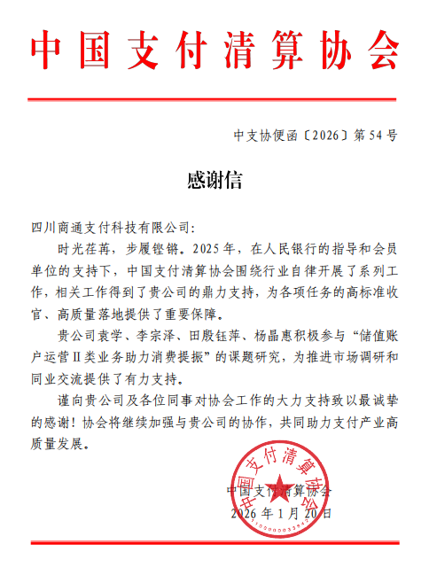 此次获中国支付清算协会感谢,既是对公司专业能力与行业贡献的认可,也是对公司未来发展的殷切期许。公司表示,在中国支付清算协会的指导下,商通科技将始终聚焦主责主业,坚守行业自律,为服务实体经济、提振消费贡献更多力量。