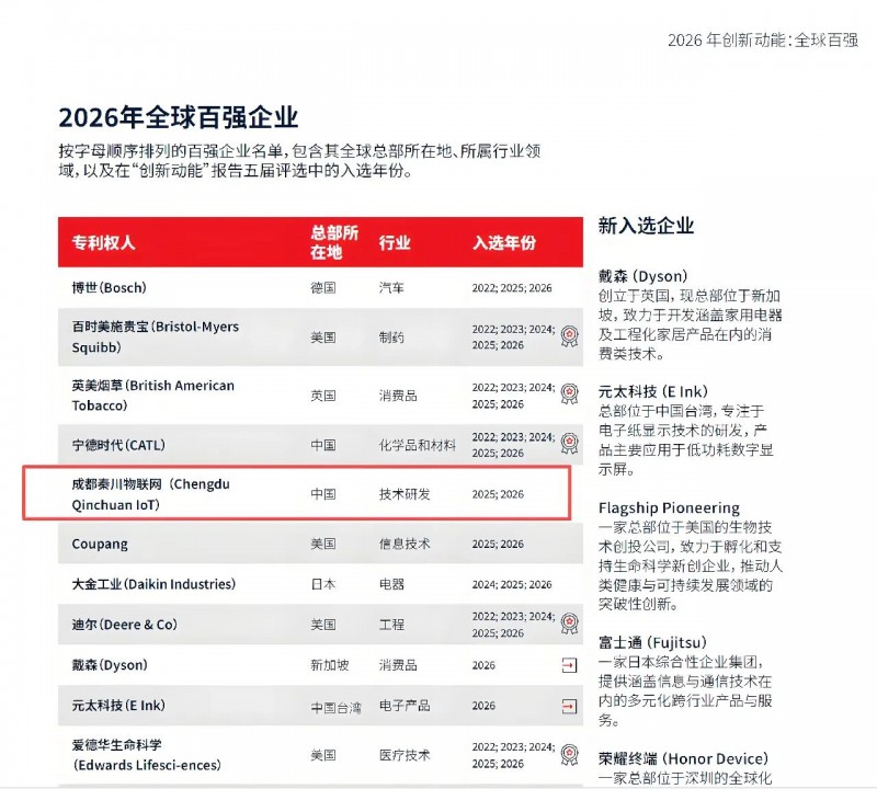 近日,LexisNexis正式发布《2026年创新动能:全球百强》知识产权报告,中国共有11家企业入选2026年全球百强创新企业, 协会会员单位成都秦川物联网科技股份有限公司荣登榜单。